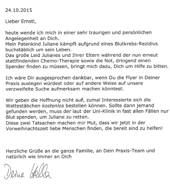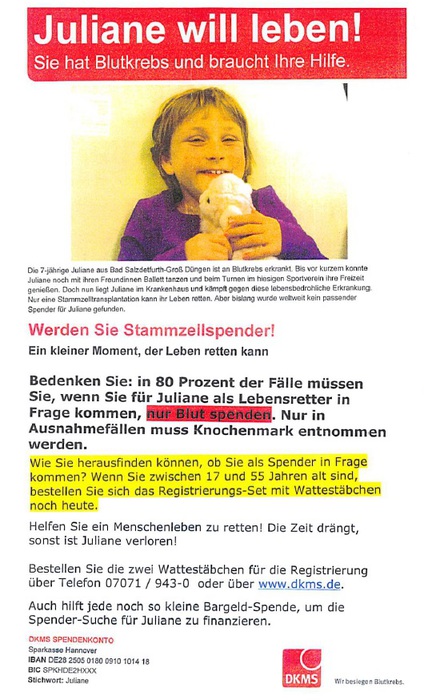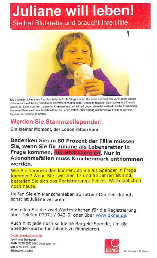 auf unten eingescanntem Flyer bitten wir um Unterstützung speziell für die kleine Juliane - ein Patenkind einer Kollegin - und für viele andere Blutkrebs- Patienten.